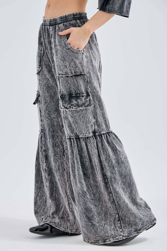 Mineral Wash Wide Pants with Raw Hem & Frayed Details - Ash Black