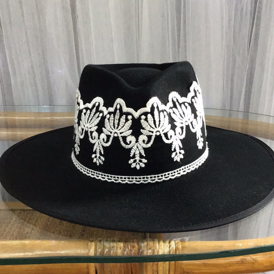 Olive & Pique Black Pinched Crown Fedora with Brown Lace Band