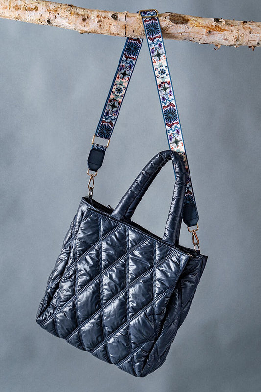Diamond Quilted Puffer Cross Bag with Strap - Navy