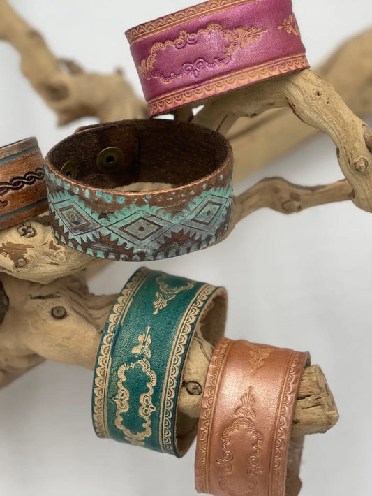 Western Tooled Turquoise Stone Leather Cuff Bracelet