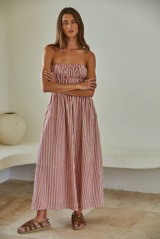 Woven Cotton Linen Striped Tube Neck Strapless Flare