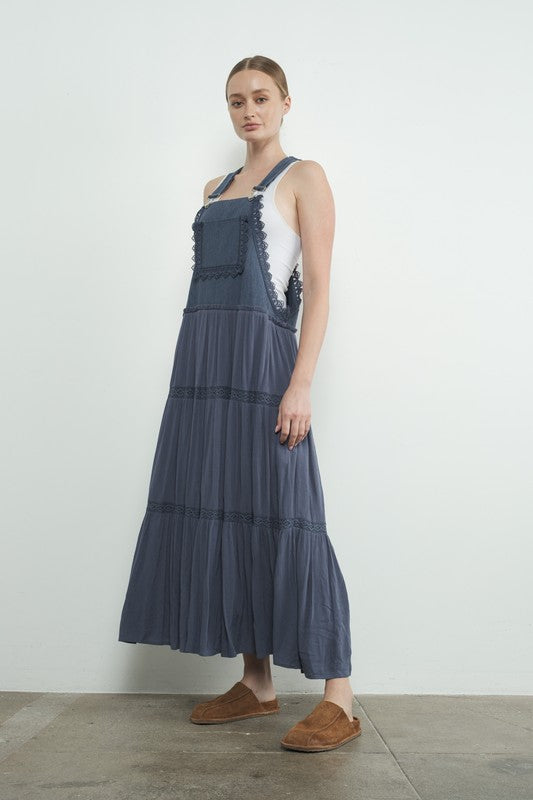 Lace Trim Tiered Overall Maxi Dress - Black