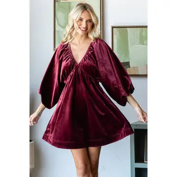 Velvet Puff Sleeve Deep V-Neck Dress