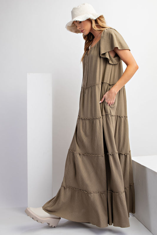 Linen Soft Washed Tiered Maxi Dress - Ash Olive