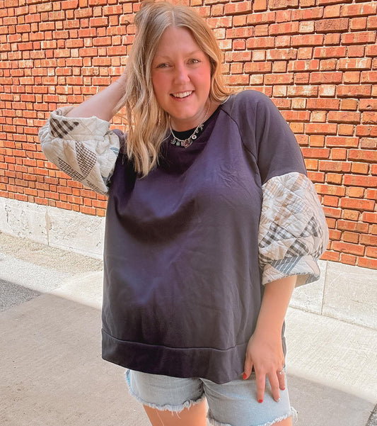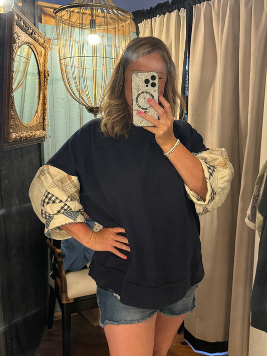Quilted 3/4 Sleeve Sweatshirt - Navy