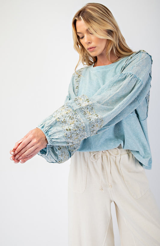 Washed Knit Mix Print Cotton Slub Top - Dusty Blue