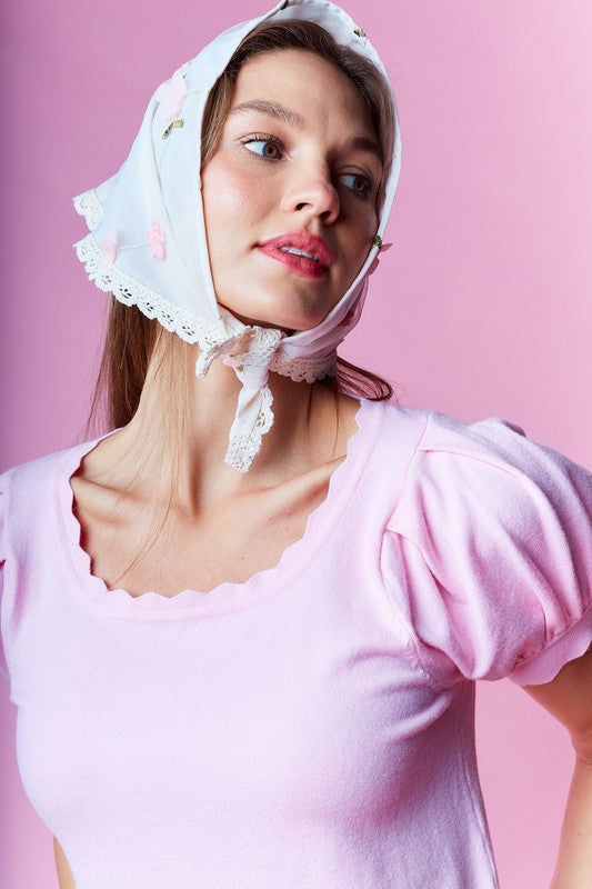 Scallop Edge Puff Sleeve Crop Knit Sweater - Pink