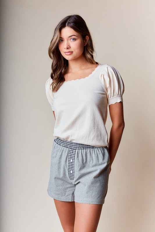 Scallop Edge Puff Sleeve Crop Knit Sweater - Beige