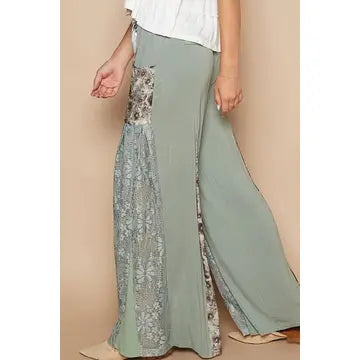 Lace Printed Fabric Contrast Wide Leg Pants - Deep Grass