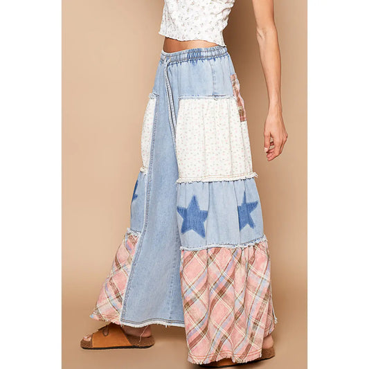 Star Patch Detail Solid Chambray Wide Pants - Denim