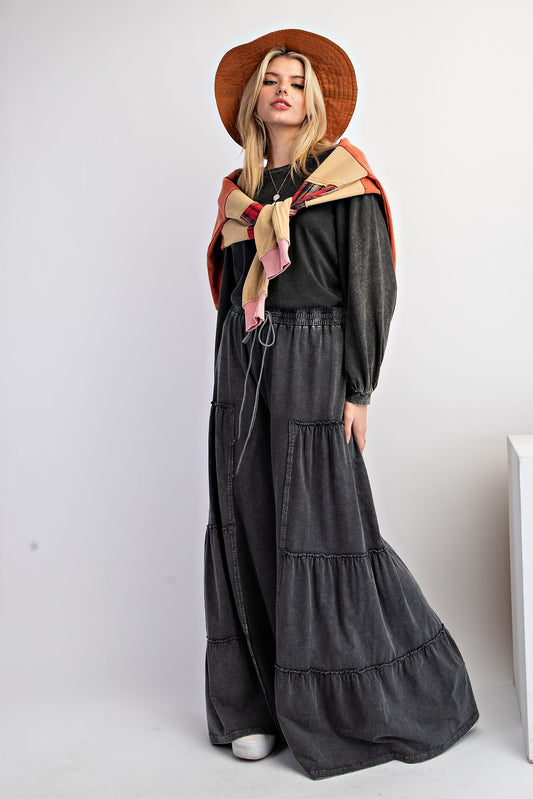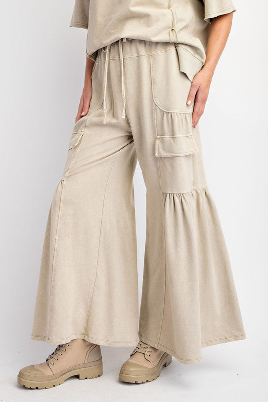 Mineral Washed Tiered Wide Leg Pants - Mocha