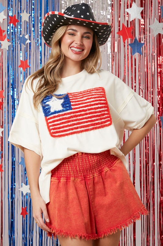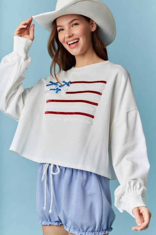 Crew Neck Flag Sparkle Trim Crop Sweatshirt - White