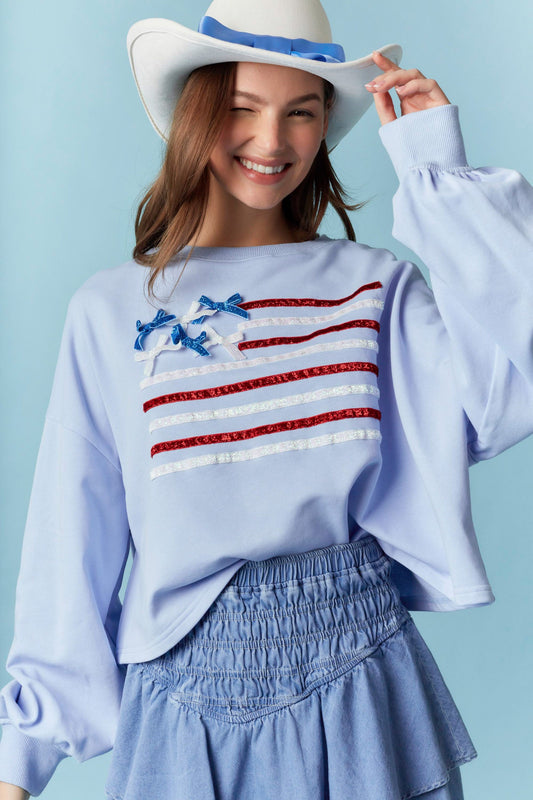 Crew Neck Flag Sparkle Trim Crop Sweatshirt - Light Blue