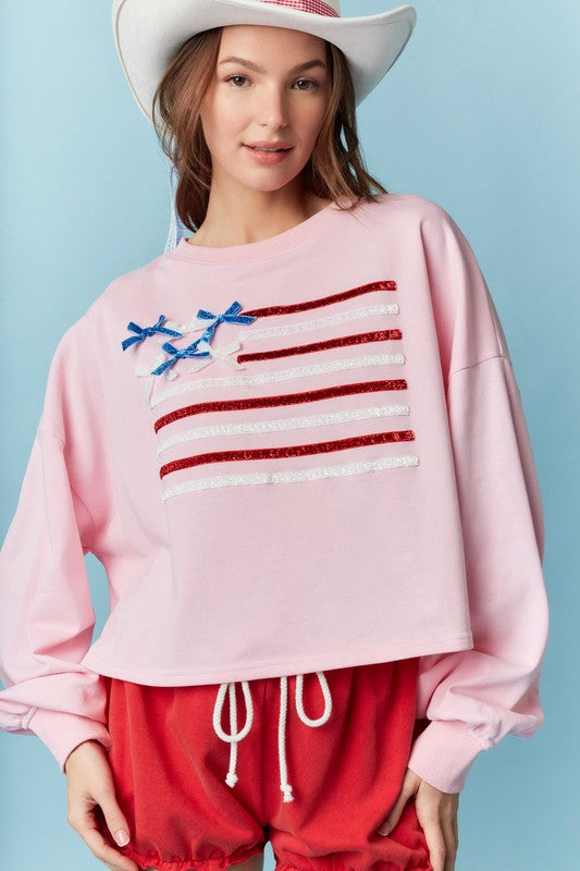 Crew Neck Flag Sparkle Trim Crop Sweatshirt - Pink