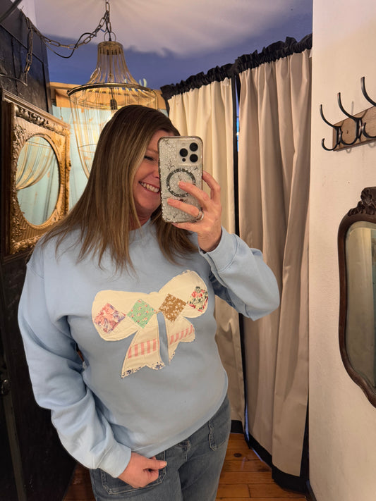 Vintage Quilt Bow Sweatshirt - Light Blue