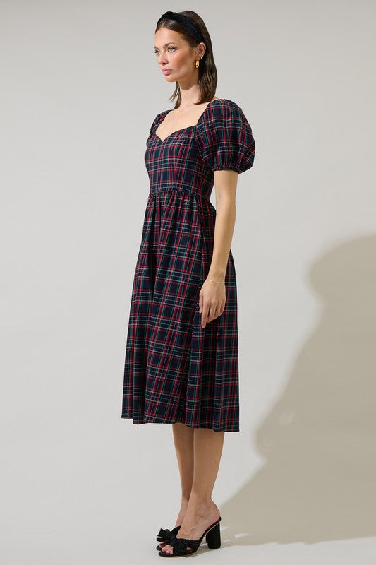 Arvada Plaid Puff Sleeve Midi Dress - Navy