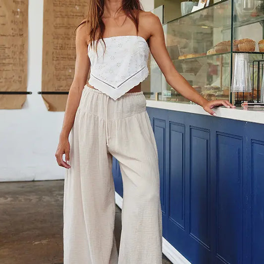 Wide Leg Solid Cotton Gauze Pants - Natural