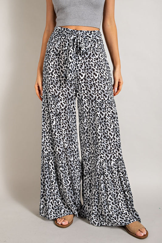 Animal Print Tiered Wide Leg Pants - Grey Leopard