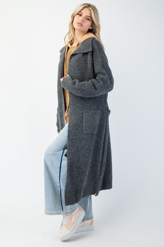Tie Waist Maxi Knit Cardigan - Charcoal