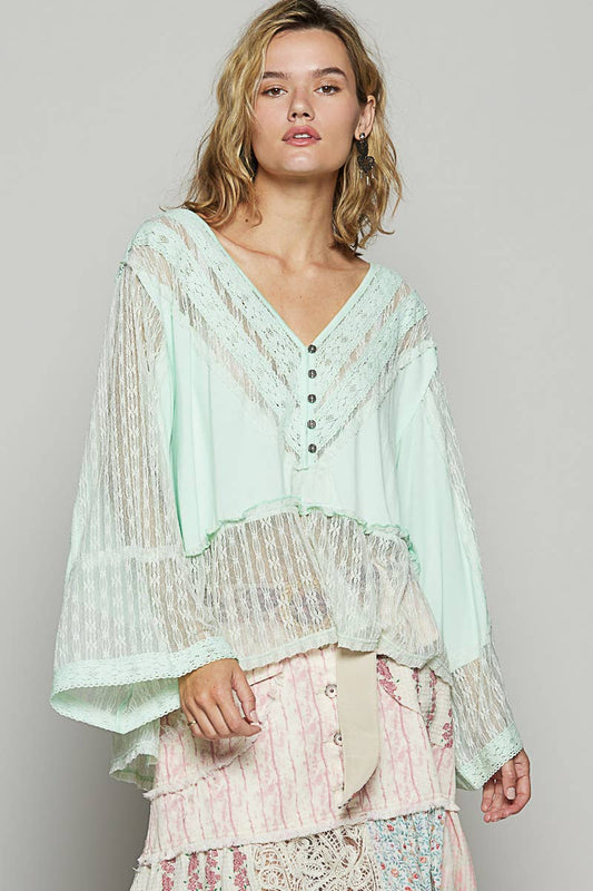 Inset Lace Outseam Short Sleeve V-neck Tee