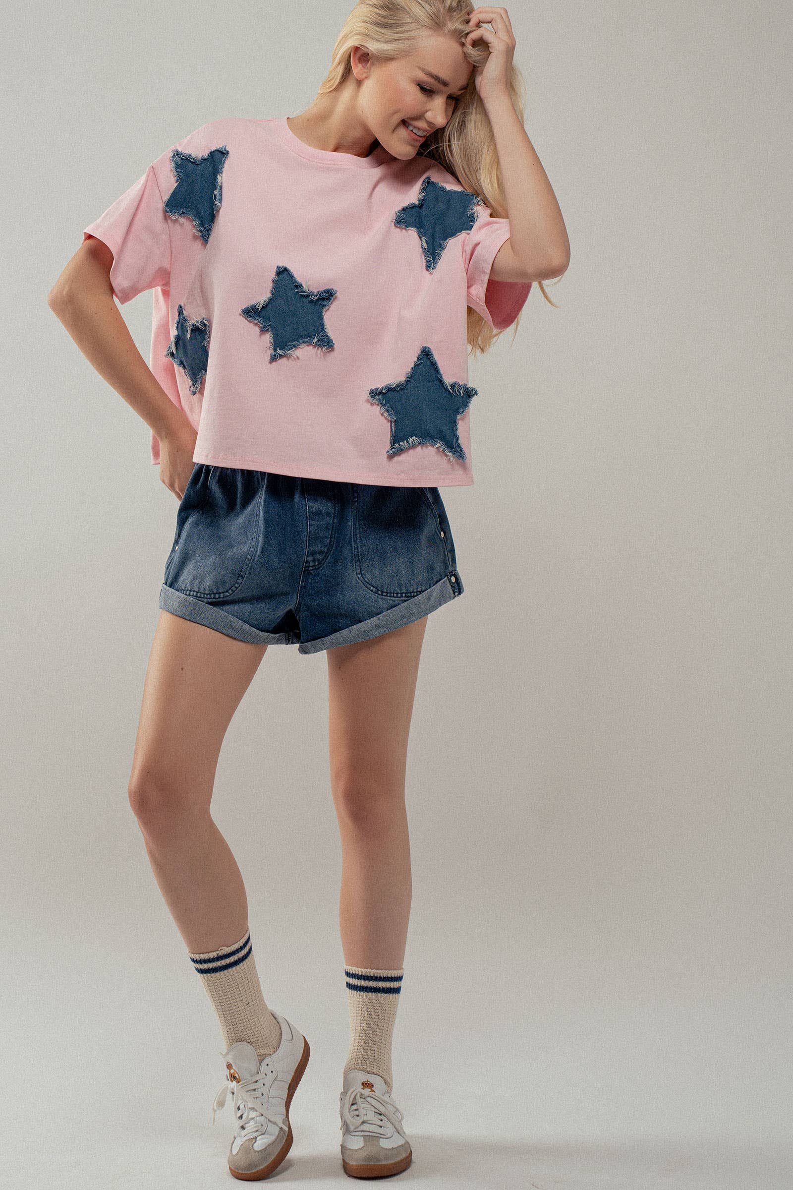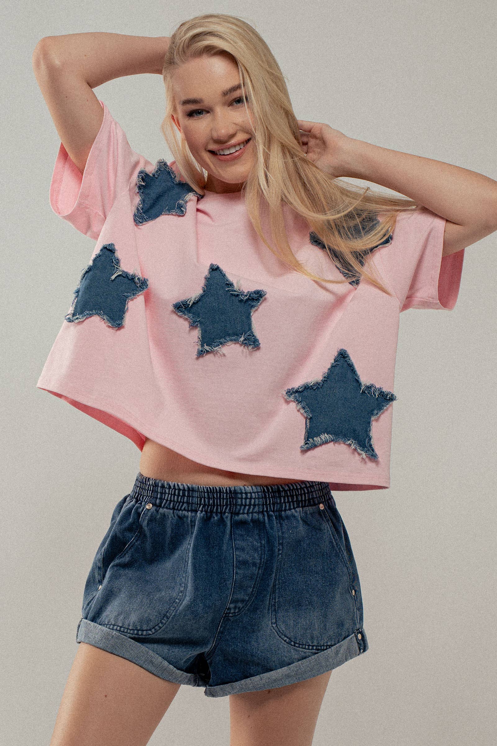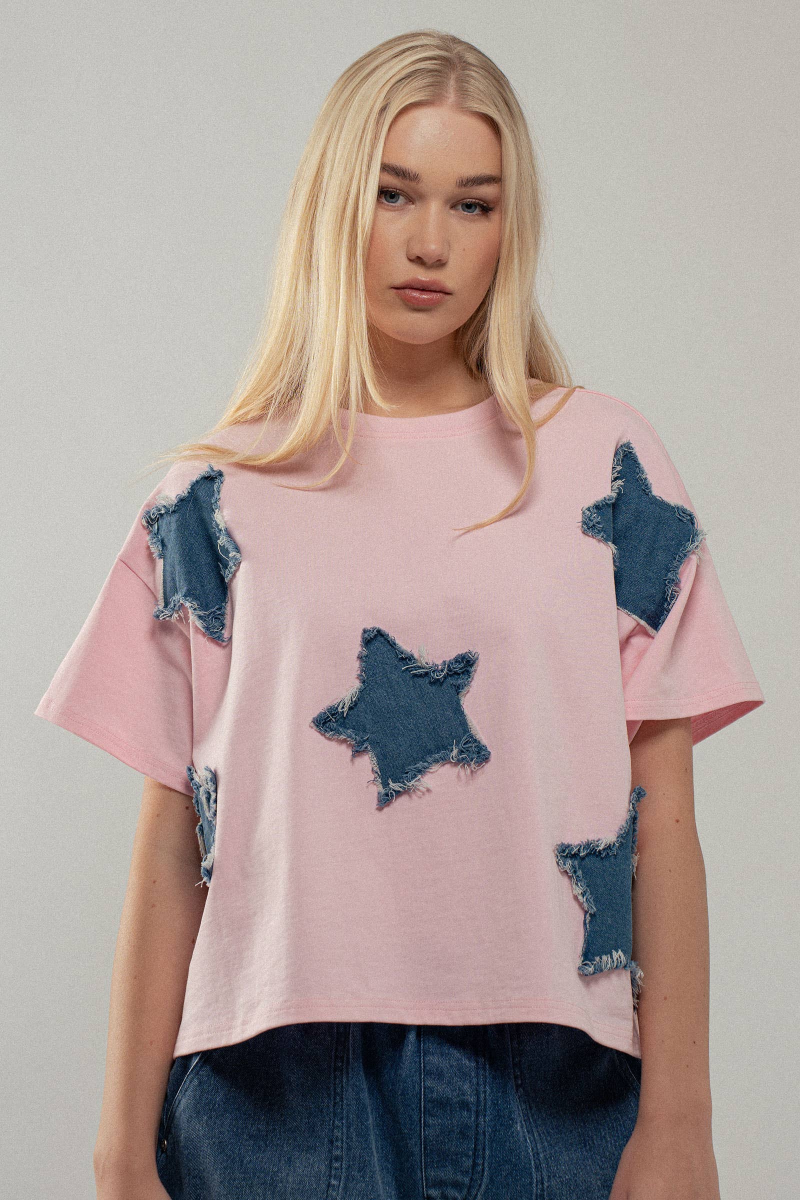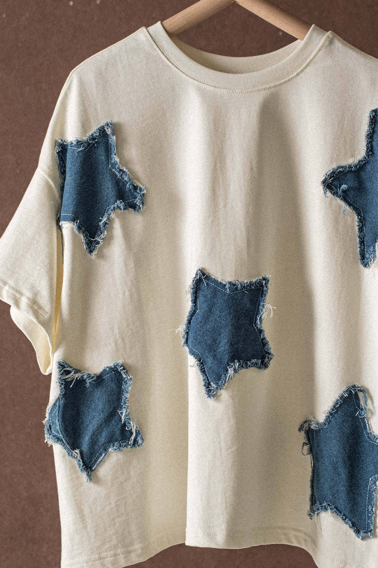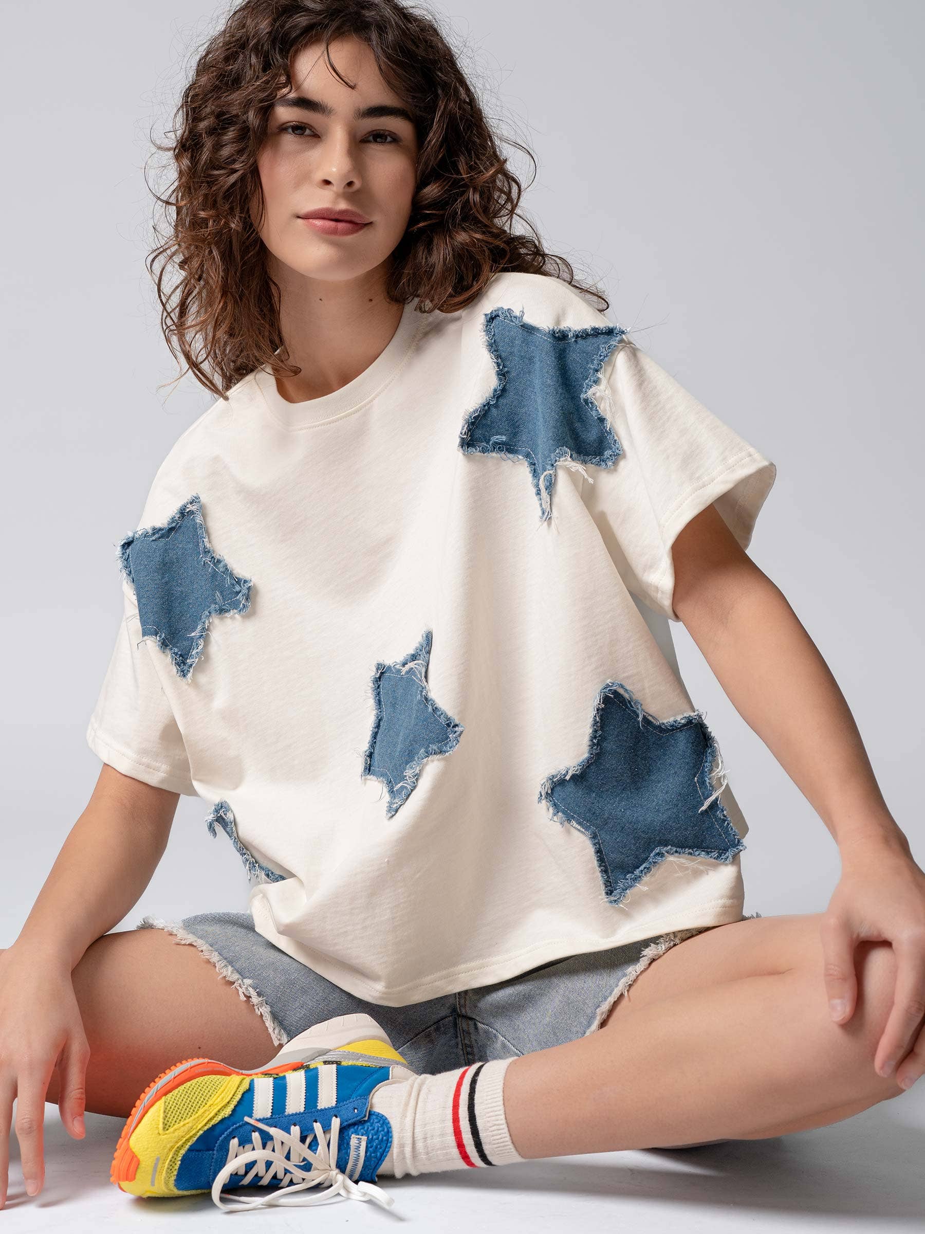 This playful tee features distressed denim star appliqués on a soft cream backdrop, offering a bold western-inspired aesthetic.
