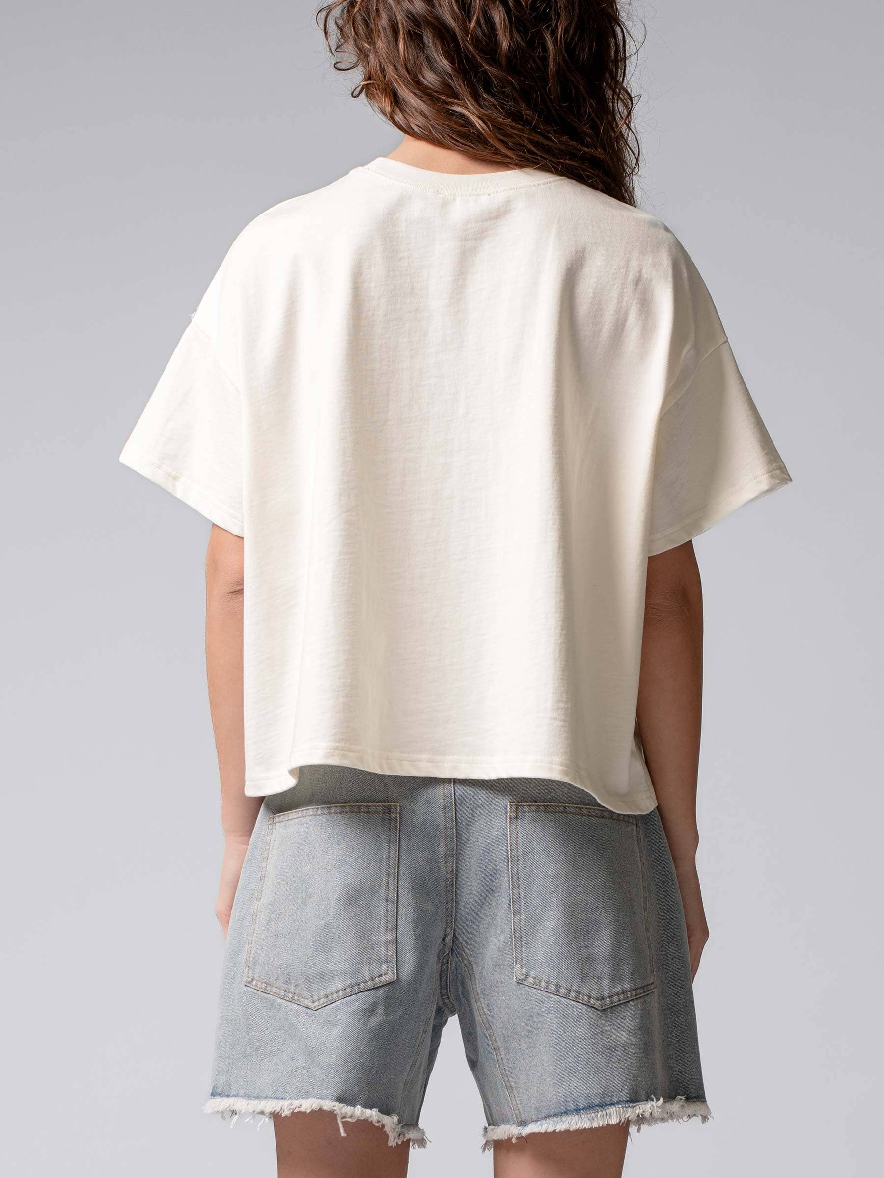 Features: • 100% Cotton • S-L: 2-2-2 • Distressed denim star appliqués for a textured look • Oversized fit for comfort and layering • Soft cream fabric ideal for casual or western-inspired wear • Crew neckline and short sleeves for classic styling