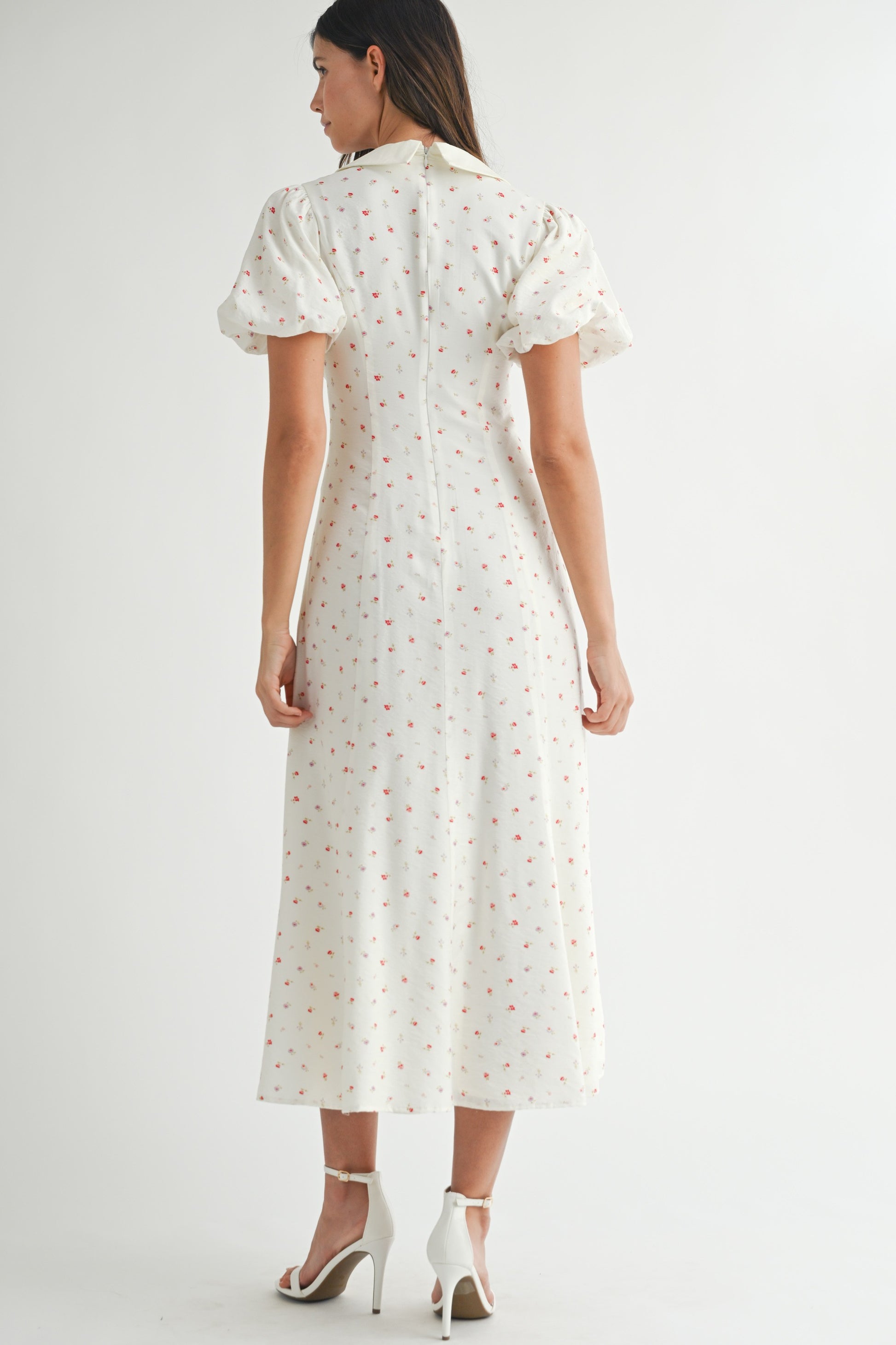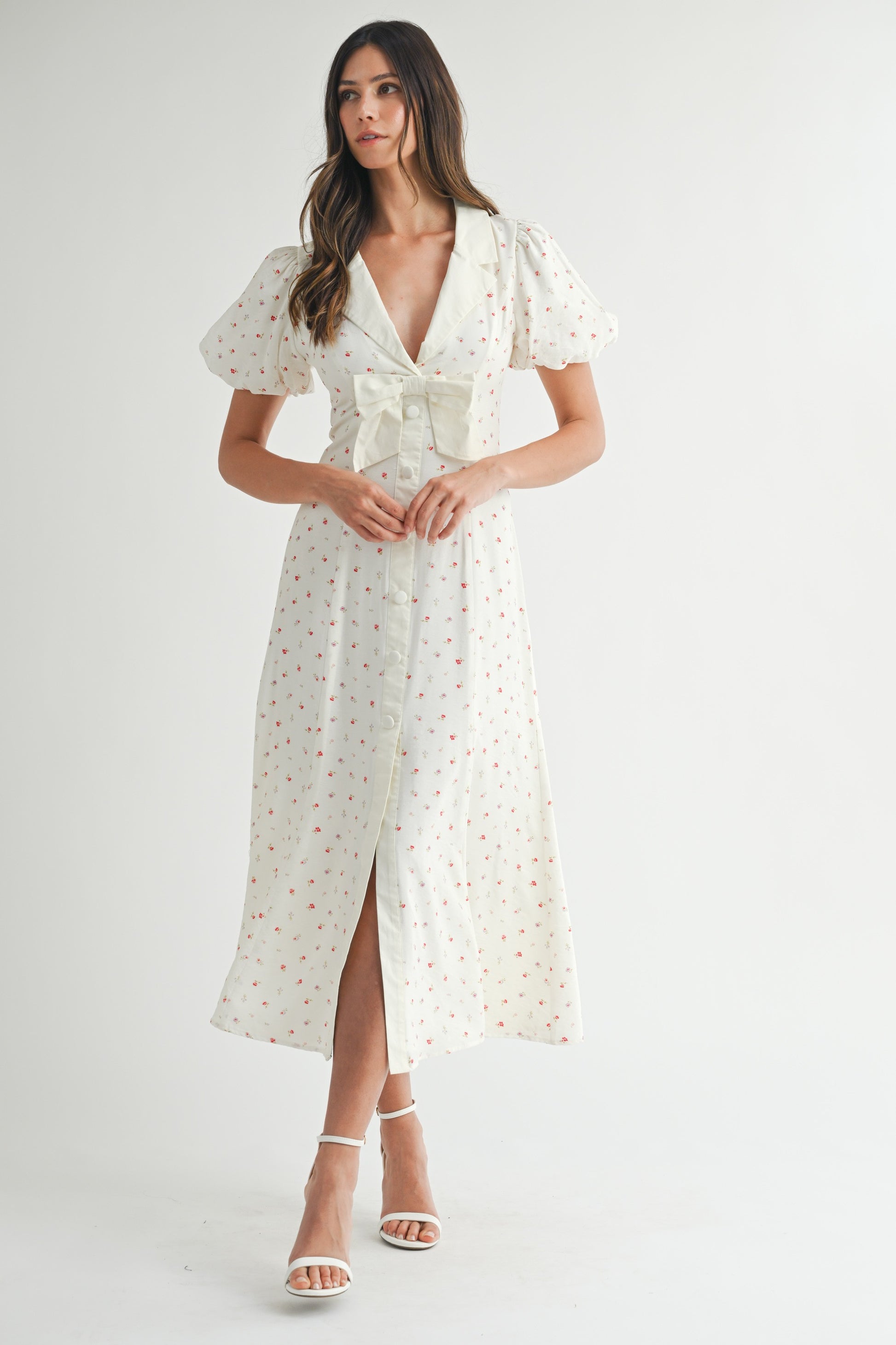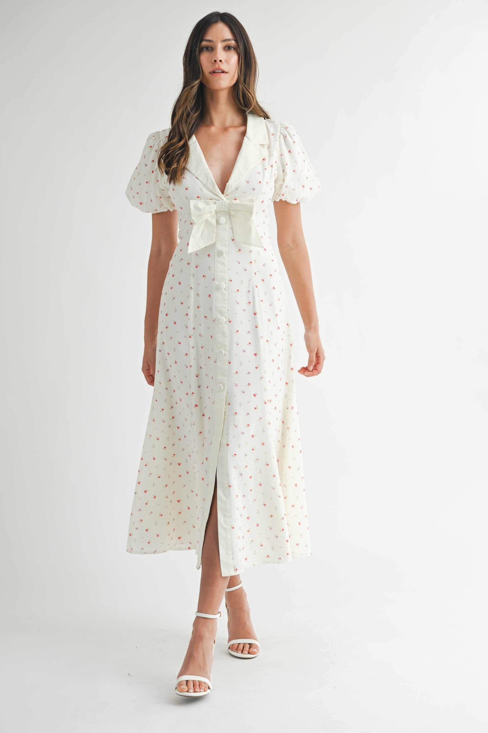 Ditzy floral printed puff short sleeve collar button down midi dress with front bow detail.