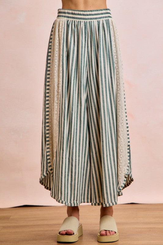 Floral Eyelet Side Elastic Stripes Wide Leg Pants