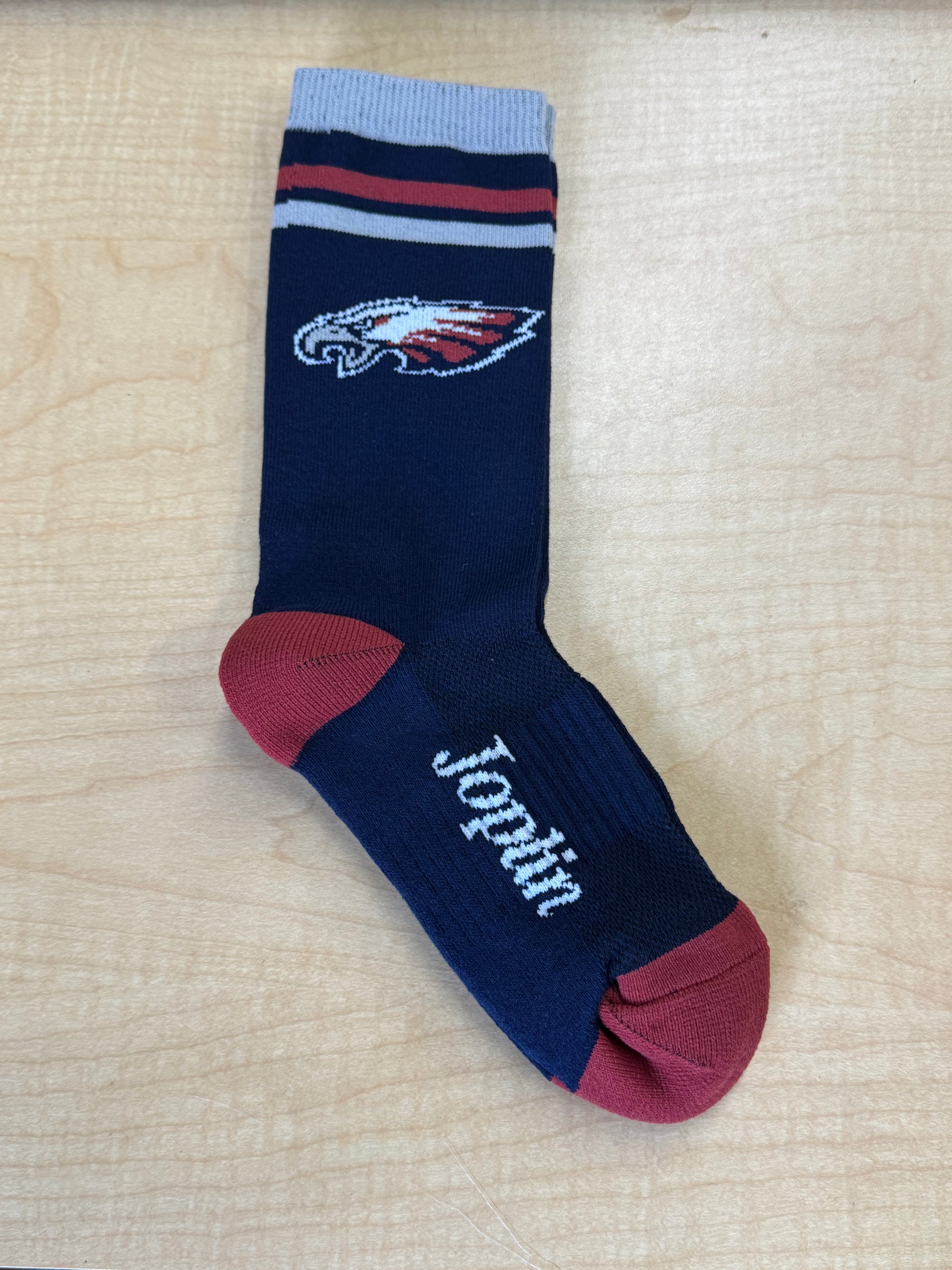 Joplin printed on the foot and an eagle mascot printed on the ankle of sock.