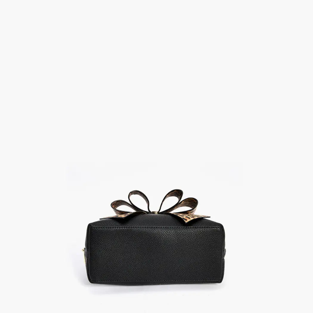 Two compartment handbag with signature double bowtie in leopard print style. Composed of premium saffiano vegan leather with a sturdy braided top handle finish. Gold hardware detailing for zipper and two top handles. Inner slip pocket for extra organization with an elegant leopard print polyester lining. A kitsch topper to your next Fall and Winter outfit. Fits smaller daily essentials like headbands, hair clips, and sunglasses.
