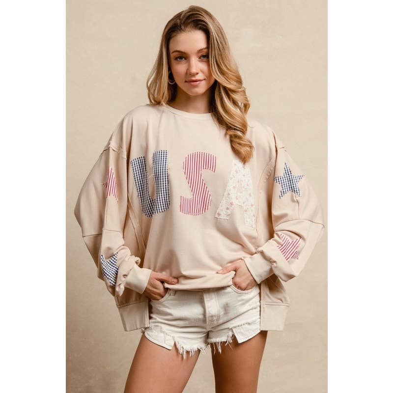 The Mix and Match USA Patchwork Oversized Sweatshirt is a bold and comfortable piece that combines casual style with patriotic flair.
