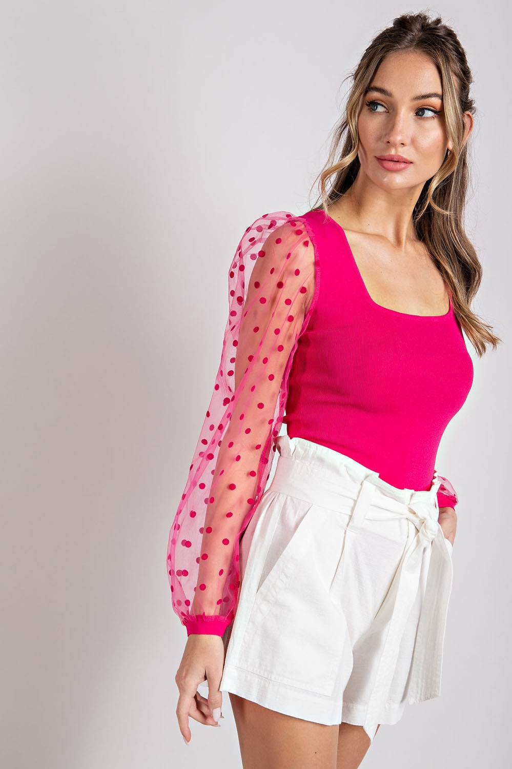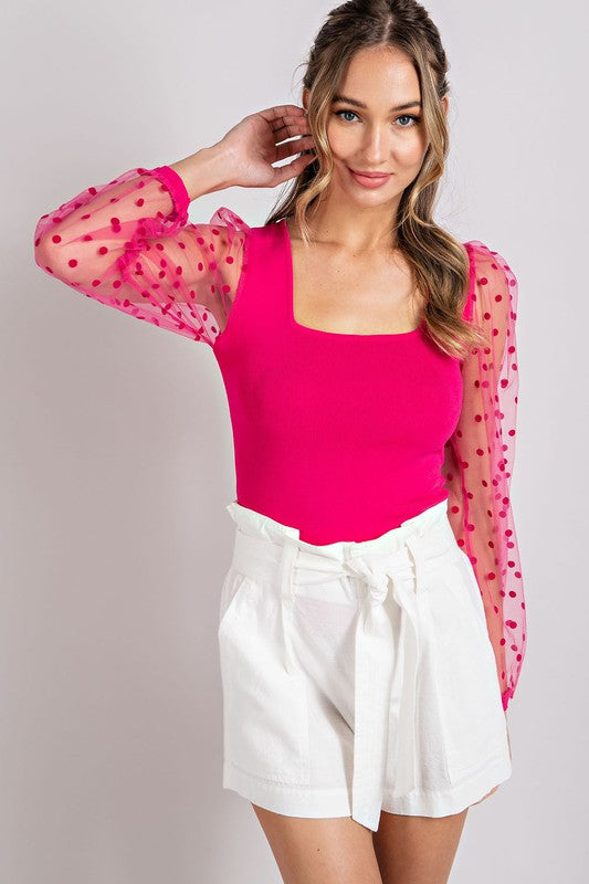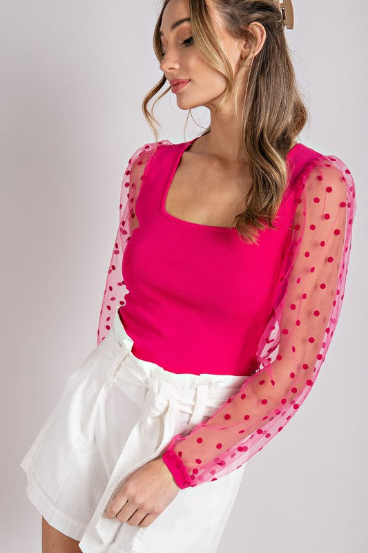One of a kind polka dot mesh sleeve top with puff sleeves and a square neckline.