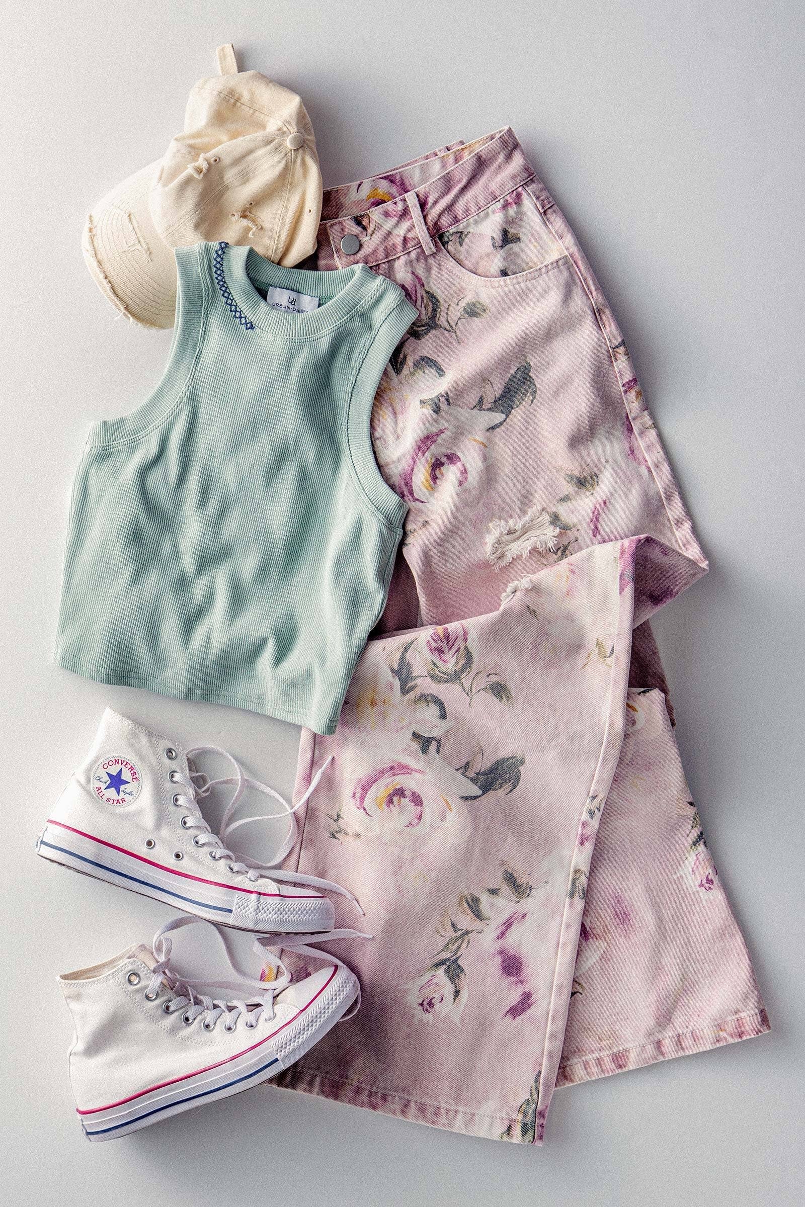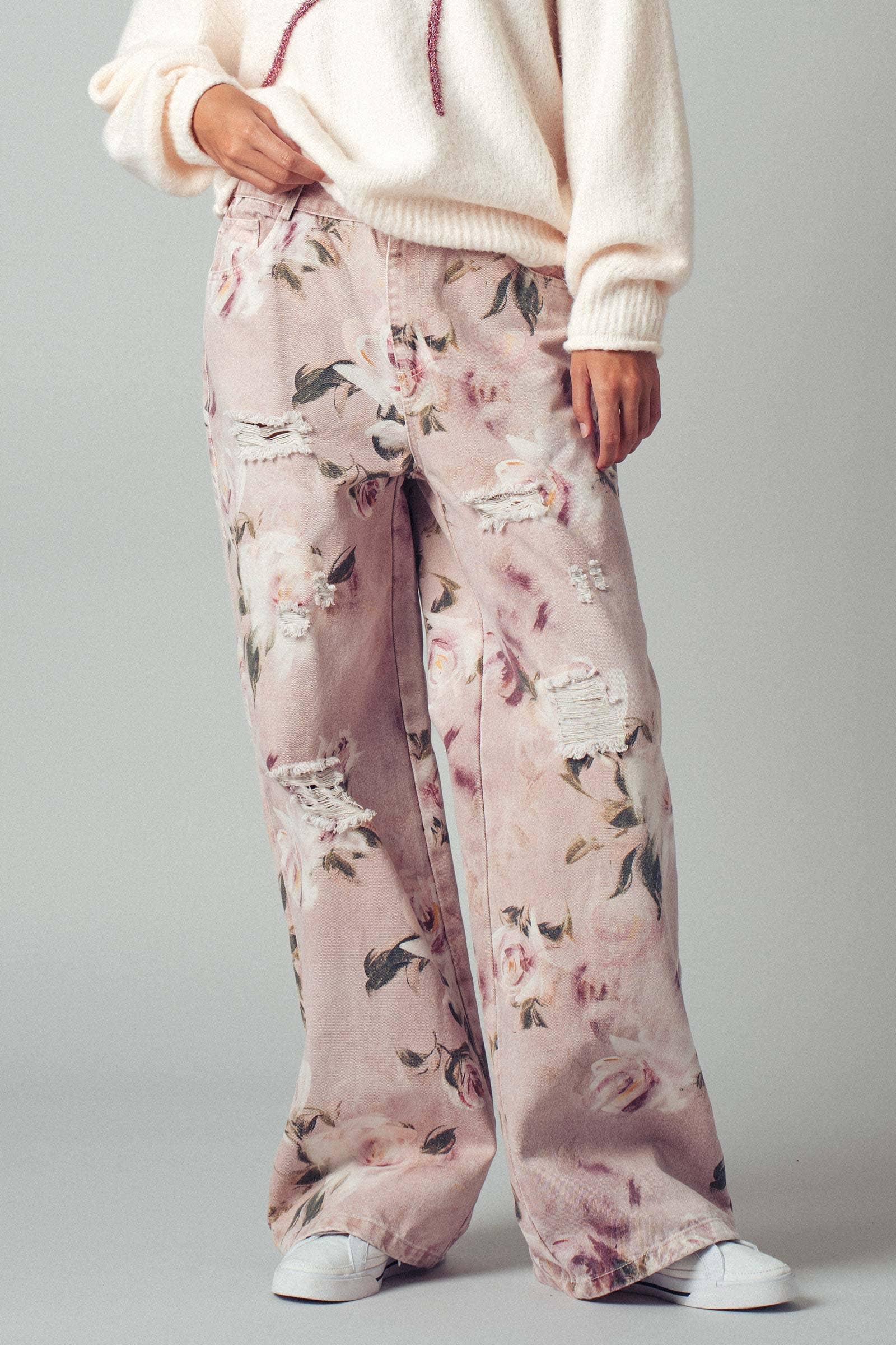 These stylish denim pants feature a soft pink backdrop adorned with delicate rose prints and distressed detailing, offering a relaxed fit and high-rise waist for effortless styling.
