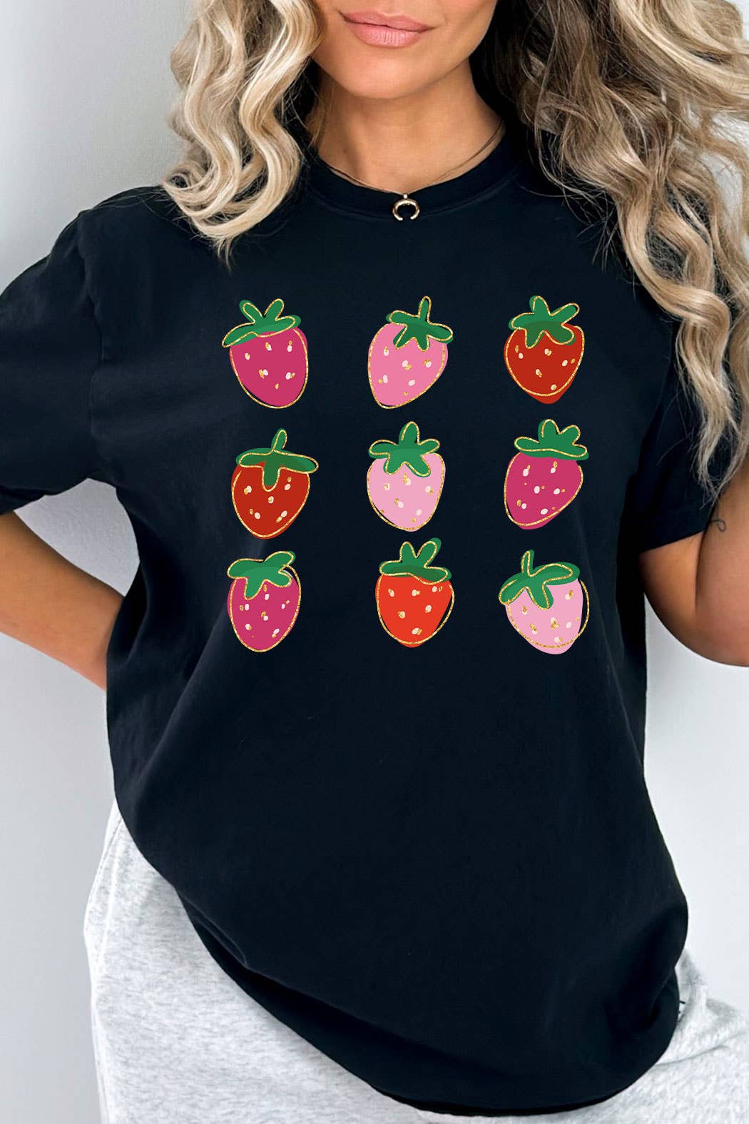 This printed tee features a playful grid of vibrant strawberries with a trendy cold edge design, making it the perfect pick for fruit lovers and summer style seekers.
