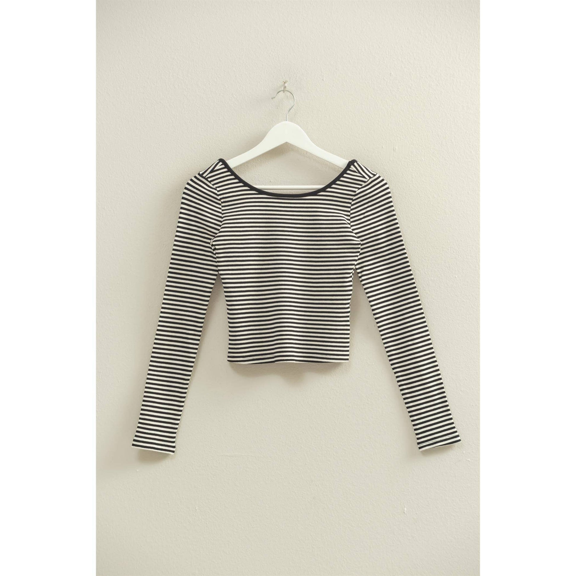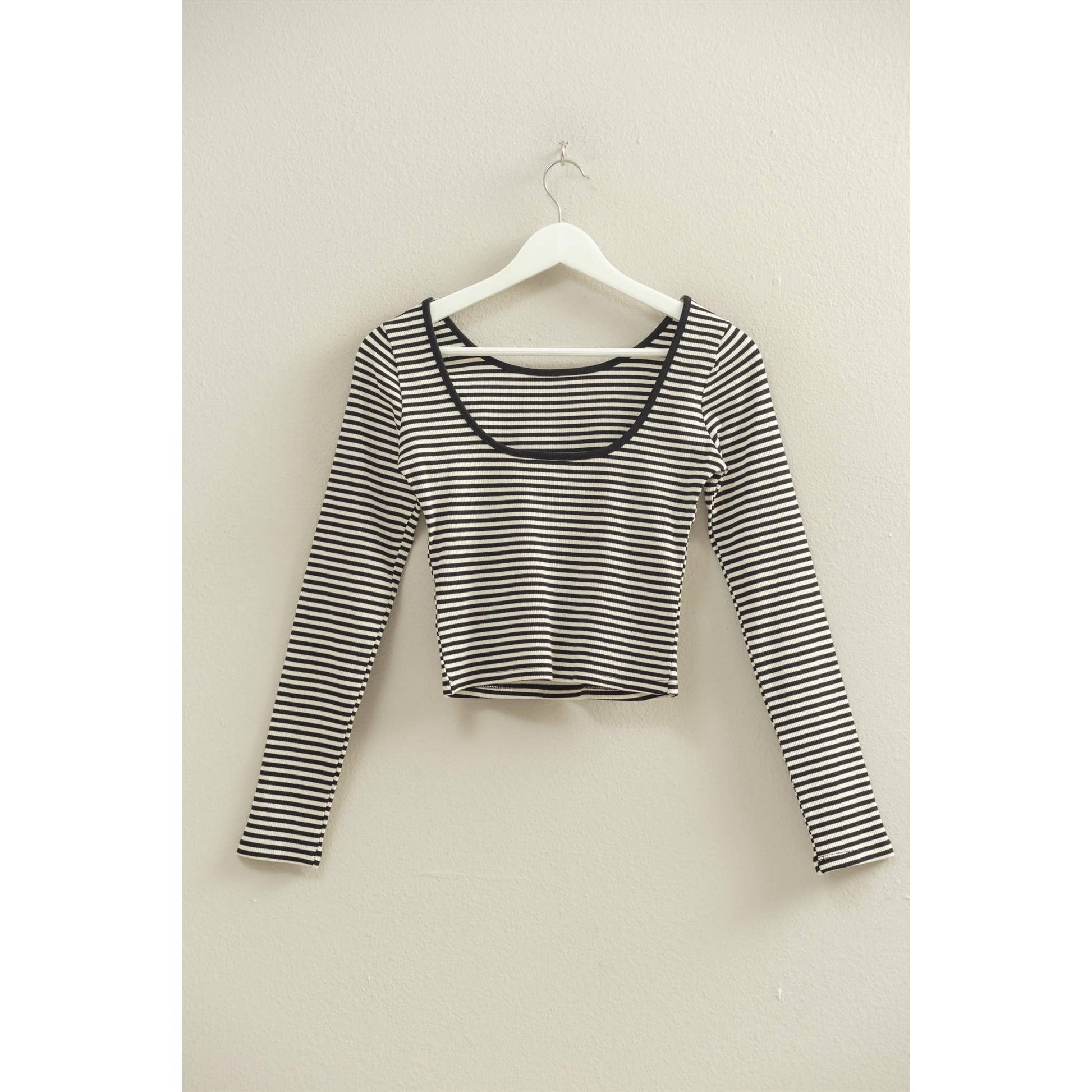 Embrace A Timeless Look With This Stylish Long Sleeve Top, Featuring A Classic Stripe Pattern That Exudes A Casual Yet Chic Vibe. The Top Showcases A Flattering Scoop Neckline And A Comfortable Fit That Hugs The Silhouette Lightly, Making It A Versatile Piece For Varying Occasions. Ideal For Layering, This Top Enhances Its Appeal When Paired With Denim Jackets Or Casual Blazers. 95% Cotton 5% Spandex Model Is 5' 7" Tall, 32" Chest, 25" Waist, 34" Hips And Wearing A Size Small Imported. Designed in the USA