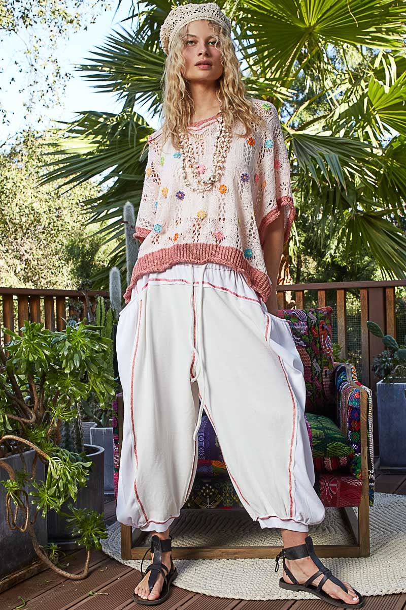 Designed in V-neck sleeveless sweater top in acrylic with flower point, outseam and rolling edge, color blocked band point, solid color